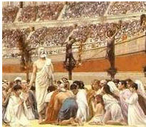 "This power of prayer can be illustrated by the story that goes back to the fourth century - the monk [Telemachus] living in a little remote village, spending most of his time in prayer... One day he heard the voice of God telling him to go to Rome... Weeks later, he arrived...at a time of a festival in Rome...He followed a crowd into the Coliseum, and then, there in the midst of this great crowd, he saw the gladiators come forth, stand before the Emperor, and say, 'We who are about to die salute you.' He realized they were going to fight to the death for the entertainment of the crowds. He cried out, 'In the Name of Christ, stop!' And his voice was lost in the tumult there in the great Colosseum. And as the games began, he made his way down through the crowd and climbed over the wall and dropped to the floor of the arena. Suddenly the crowds saw this scrawny little figure making his way out to the gladiators and saying, over and over again, 'In the Name of Christ, stop!' And they thought it was part of the entertainment, and at first they were amused. But then, when they realized it wasn't, they grew belligerent and angry. And as he was pleading with the gladiators, 'In the Name of Christ, stop!' one of them plunged his sword into his body. And as he fell to the sand of the arena in death, his last words were, 'In the Name of Christ, stop!' And suddenly, a strange thing happened. The gladiators stood looking at this tiny form lying in the sand. A silence fell over the Colosseum. And then, someplace up in the upper tiers, an individual made his way to an exit and left, and the others began to follow. And in the dead silence, everyone left the Colosseum. That was the last battle to the death between gladiators in the Roman Colosseum. Never again did anyone kill or did men kill each other for the entertainment of the crowd. One tiny voice that could hardly be heard above the tumult. 'In the Name of Christ, stop!' It is something we could be saying to each other throughout the world today. |