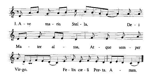 I. Ave maris Stella, Dei Mater alma, atque semper Virgo, felix caeli Porta. 2. Sumens illud Ave Gabriélis ore, funda nos in pace, mutans Hevae nomen 3. Solve vincla reis, profer lumen caecis: mala nostra pelle, bona cuncta posce. 4. Monstra te esse matrem: sumat per te preces, Qui pro nobis natus tulit esse tuus.