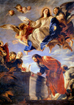 En la primera carta a los Corintios, san Pablo hace como un comentario profundo del misterio de la Asunción. Escribe así: "Cristo resucitó de entre los muertos como primicias de los que durmieron. Porque, habiendo venido por un hombre la muerte, también por un hombre viene la resurrección de los muertos. Pues del mismo modo que en Adán mueren todos, así también todos revivirán en Cristo. Pero cada cual en su rango: Cristo como primicias; luego los de Cristo en su venida» (1 Cor 15, 20-23). María es la primera que recibe la gloria; la Asunción representa casi el coronamiento del misterio pascual.