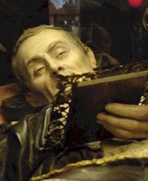 Rita de Cascia (Agustina, con tratamiento muy posterior de cera), Muere en 1457. La herida del estigma en su frente desapareció y en su lugar apareció una mancha roja como un rubí, la cual tenía una deliciosa fragancia. Debía haber sido velada en el convento, pero por la muchedumbre tan grande se necesitó la iglesia. Permaneció allí y la fragancia nunca desapareció. Por eso, nunca la enterraron. El ataúd de madera que tenía originalmente fue reemplazado por uno de cristal y ha estado expuesta para veneración de los fieles desde entonces. Multitudes todavía acuden en peregrinación a honrar a la santa y pedir su intercesión ante su cuerpo que permanece incorrupto. Mas de Sta. Rita>>> |  Stéfano Bellesini, Beato (con baño de cera tanto el cuerpo como el hábito), siglos después)